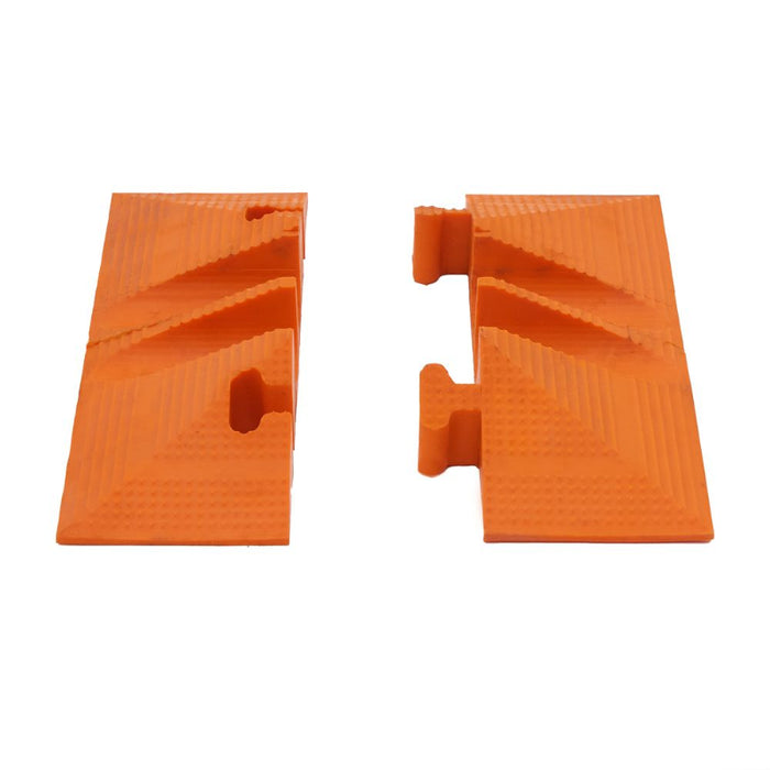 Manufactured from solid-cast polyurethane. Supports up to 16,500 lbs. per tire. Interlocking design creates finished look and reduces trip hazard of in-use cable protectors.
